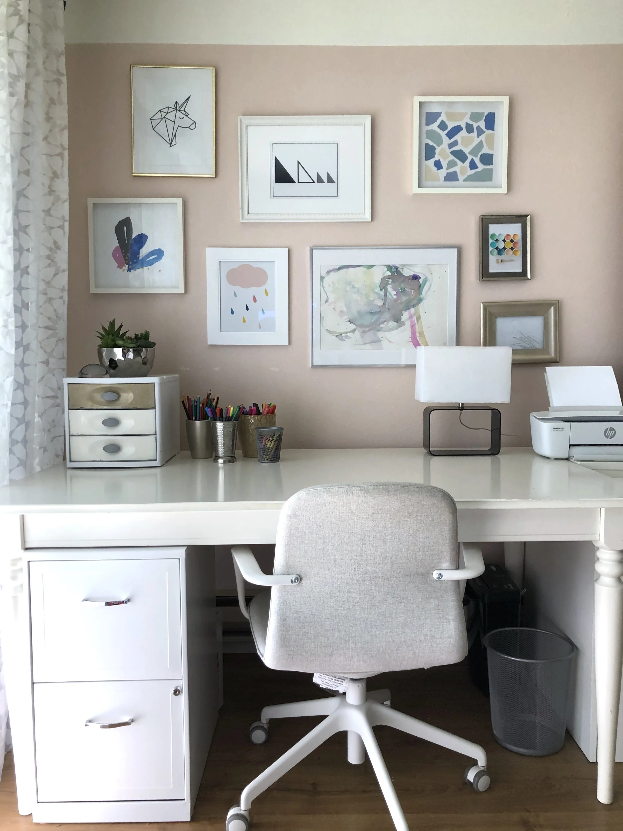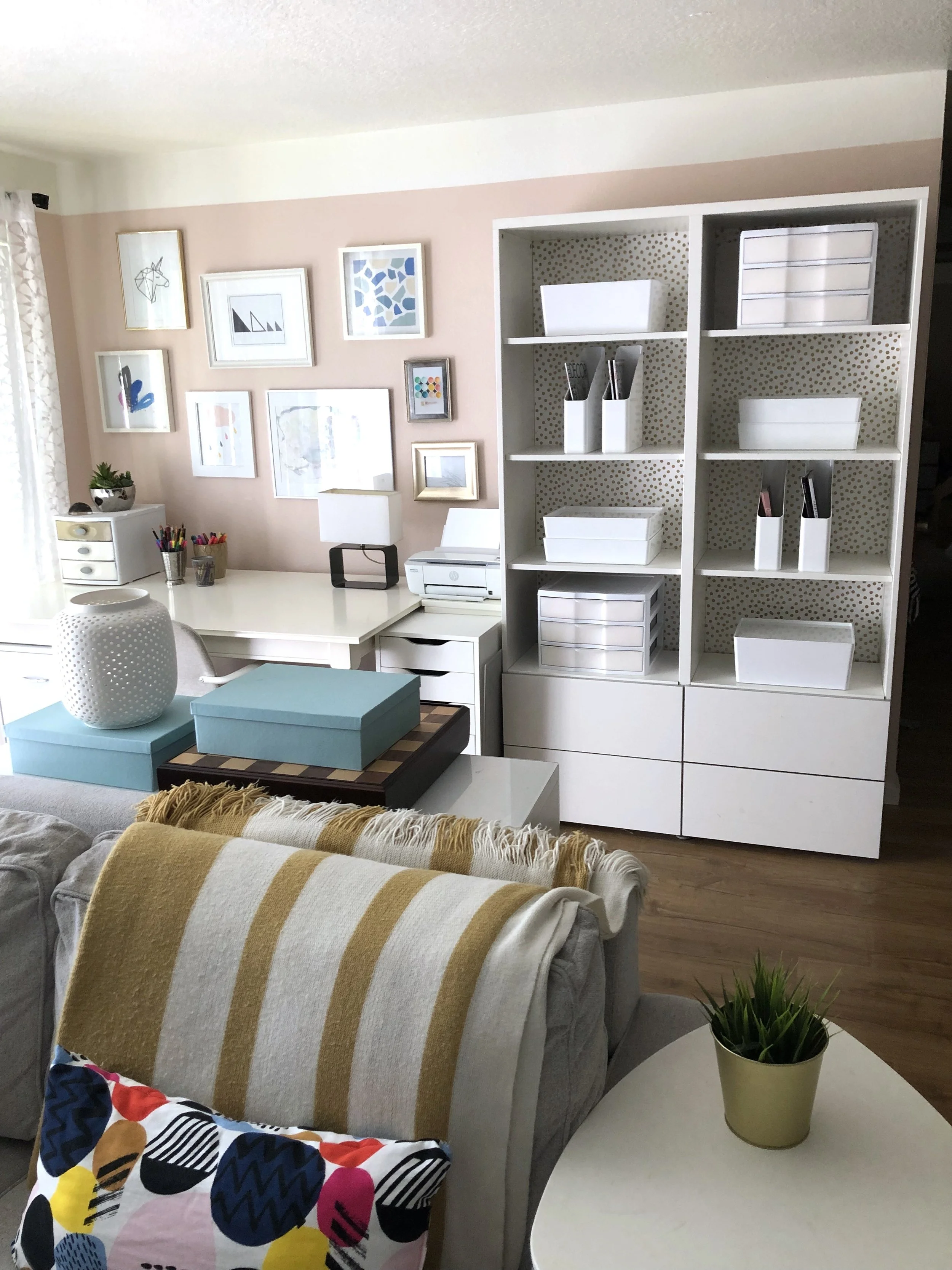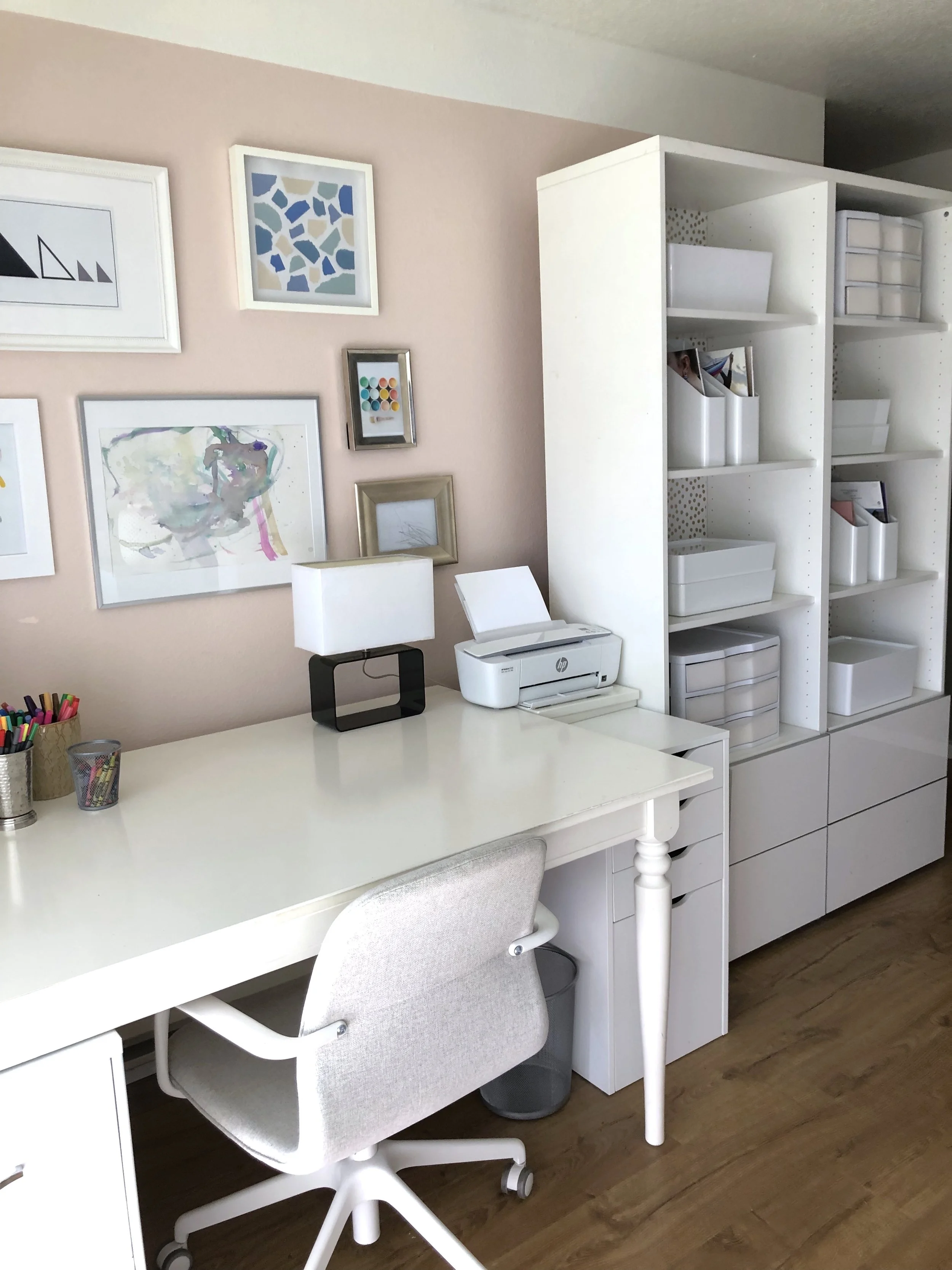 Now that I’ve incorporated this whole wall into my workspace, it not only feels cohesive by using lots of white, but it also makes the wall appear larger. The sightline continues across the whole wall, instead of your brain stopping to say, “why are there delicate and special items on display next to a desk?” (You know what I mean!) The bookcase accessorized in white storage keeps the focal point on the art collection above my desk.