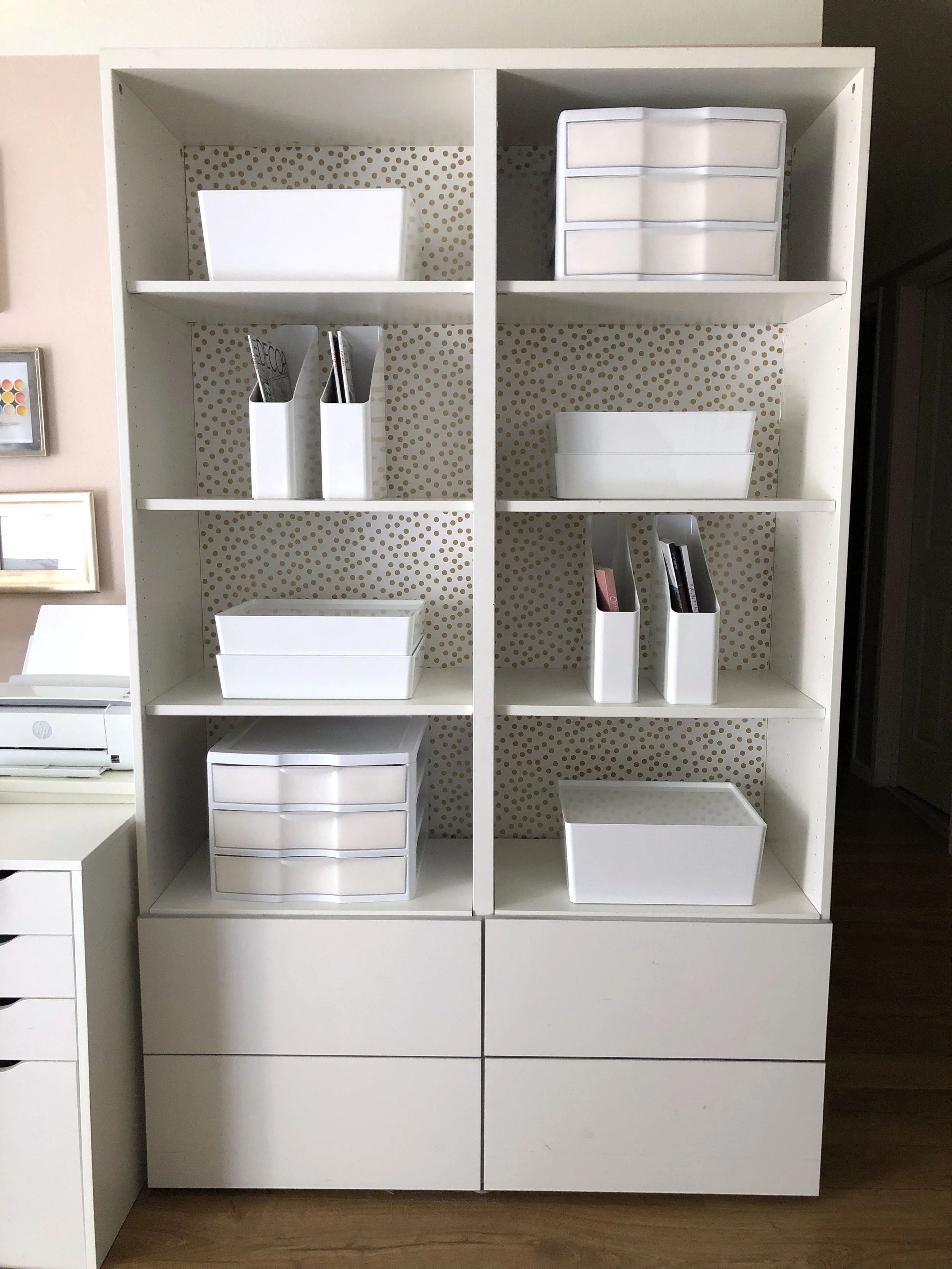 As difficult as it was to by pass the colorful selection of office organizers available today, I’m so glad I took a “safer” route and selected all glossy white finishes. The bookcase has a variety of storage but looks like a collection in the same glossy finish, which also bounces light around the room (A little design trick to reflect light in a small space). Did you spot my DIY 3-drawer paint job? My incredible hubby spray-painted the inside of the clear drawers white to hide the clutter. Thank you!! And, how could I forget my wallpaper hack?! That was a roll of wrapping paper that I cut to size- Love the Kate Spade vibe.