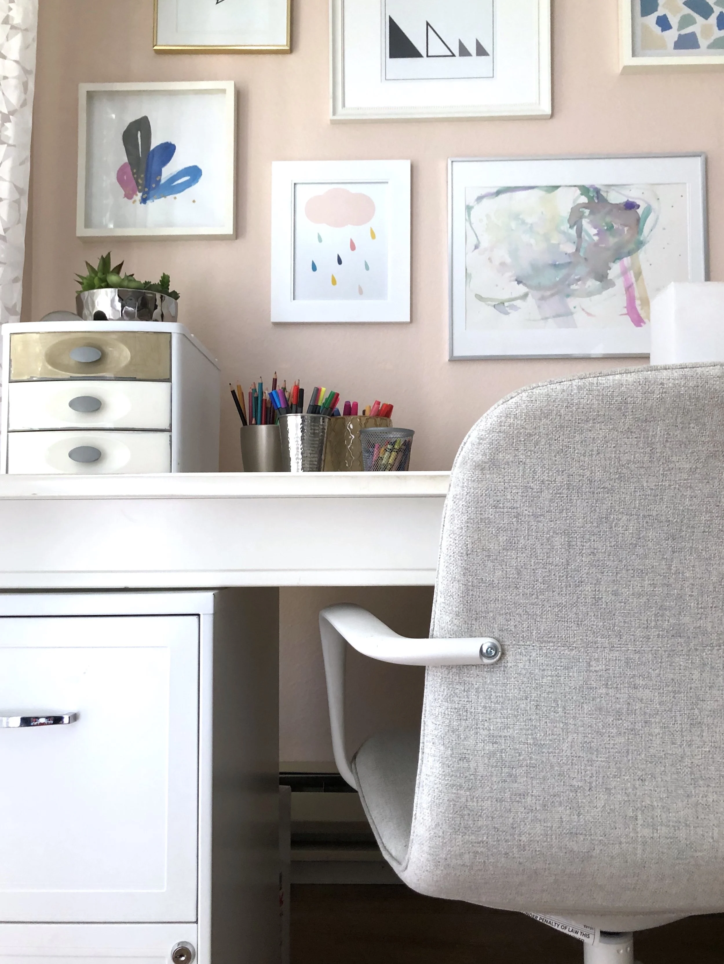 My toddler’s large watercolor artwork was the inspiration for this entire collection. I purchased 2 pieces, my baby colored another, and I created the rest myself. The goal was to showcase a variety of mediums with a color story to unite them altogether.