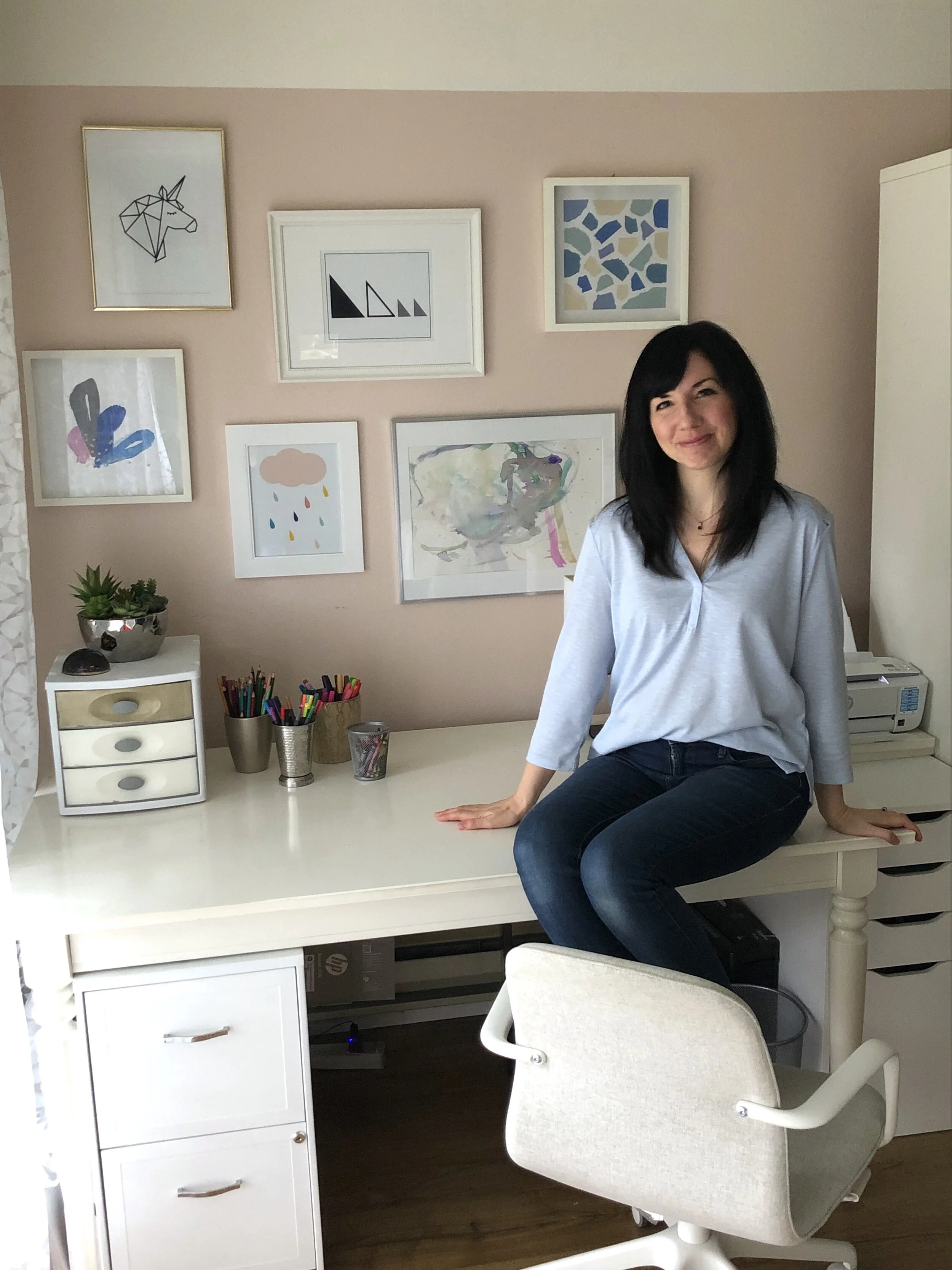 Four weeks ago the desk was a catch-all of mail and receipts, and any other paper that happened to land there. Originally I wanted to keep the artwork very uniform and simple, because I knew the desk would get messy, but 3 years later, it was just a bit boring...: