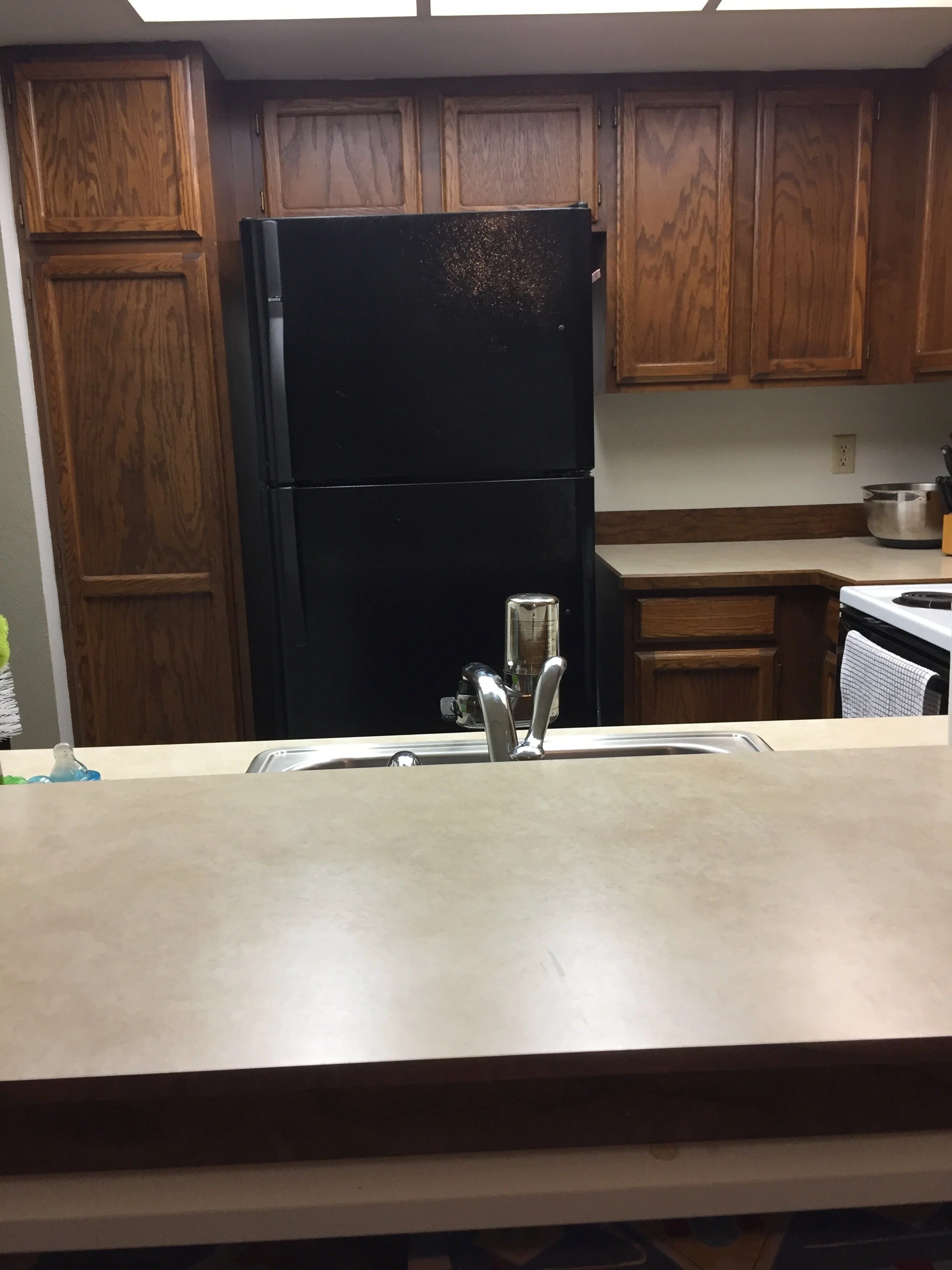 Now this is the view as you enter my kitchen. I suppose you could say the mix of white and black appliances adds a nice contrast to the design…Nope- can’t even joke about. This kitchen is the definition of blah. I will definitely be matching the finishes on the appliances and hardware for a cohesive design. I’m thinking to go all white on the appliances to brighten the space. I’ll be going white down on the floor as well. Not that I don’t love this terribly outdated pattern on the vinyl floors, but I will be refinishing the floors with the same faux marble tiles I have used in my laundry room and boys’ bathroom.