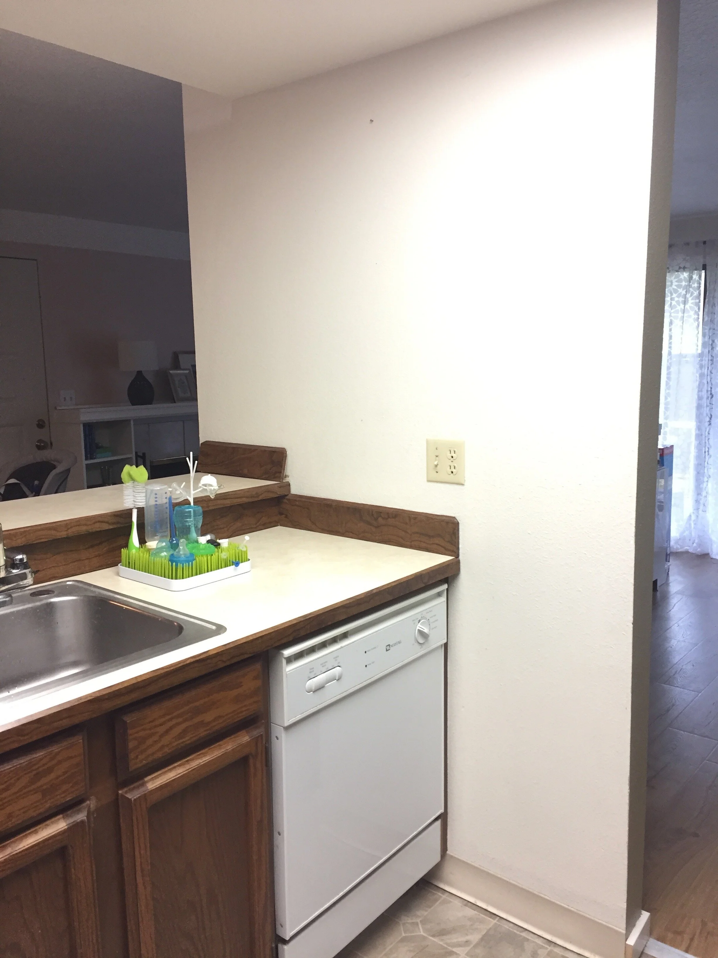This partition wall divides the kitchen from the living room, and we have been advised not to remove it. It’s not the best photo, but it does offer perspective on the pass-through (breakfast bar) and the kitchen entry. I’m sure the raised surface was intended to be a breakfast bar, but with the dining table literally 2ft away, it felt redundant. We installed bookcases under the breakfast bar for additional storage, and now use the raised counter as a pass-through. It is my favorite feature of the kitchen!