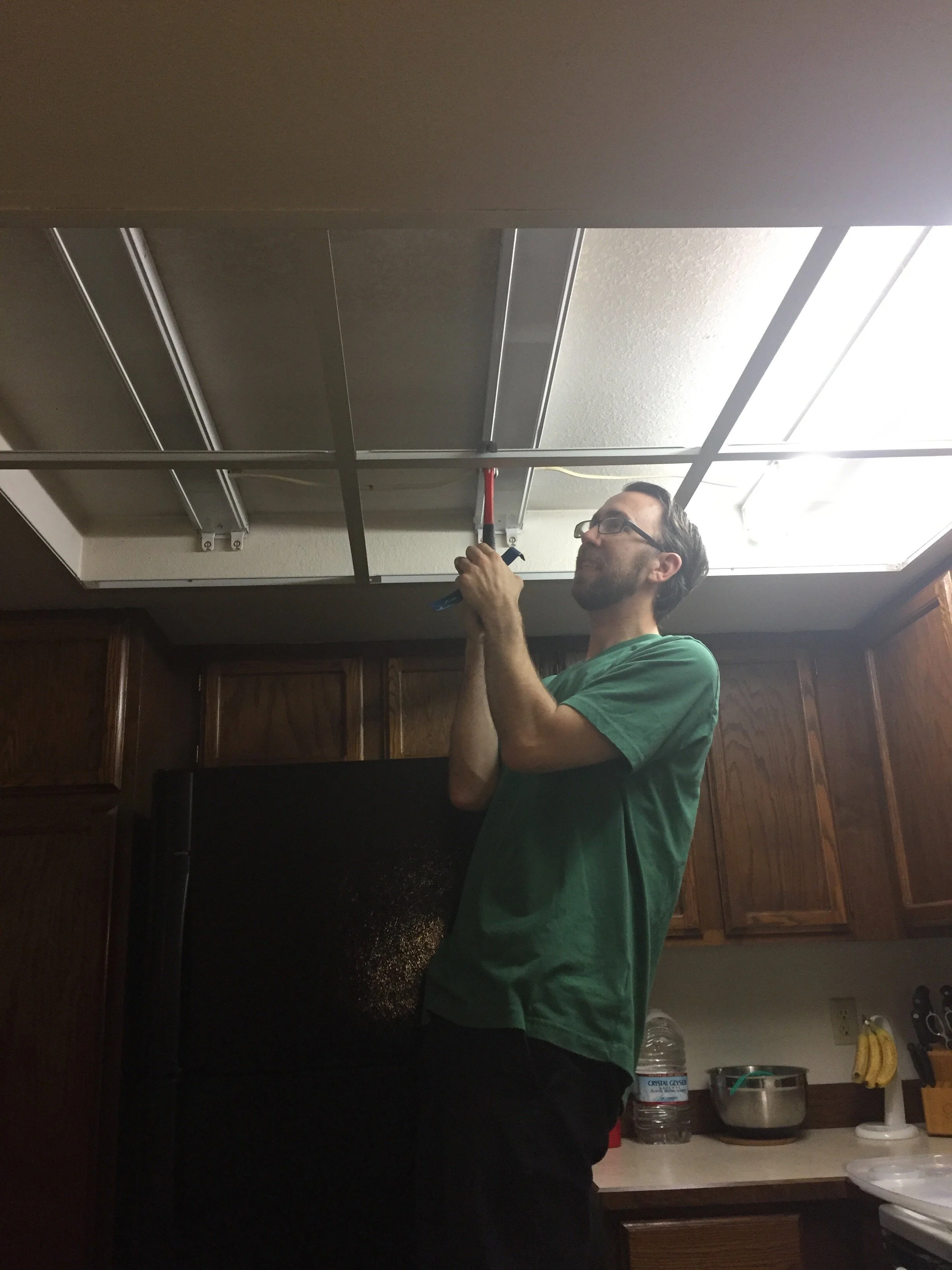 The only other thing we updated in the kitchen is the overhead lighting. We hated the dropped ceiling grid of fluorescent lights the moment we first saw the place. We never had a chance to update it when we moved in 3 years ago. (FYI- My first son surprised us 8 weeks early. We actually signed for the condo the day we brought him home from a 3 week stay in the NICU.) Then, when I was about 37 weeks pregnant with our 2nd baby, I all of a sudden felt the need to update the lights before family arrived for our son-to-be’s bris. I scheduled the electrician to install the lights a week later, and my husband tore out the current lights to keep costs down. The only thing we weren’t expecting was for me to go into labor two days later- Oy vey!